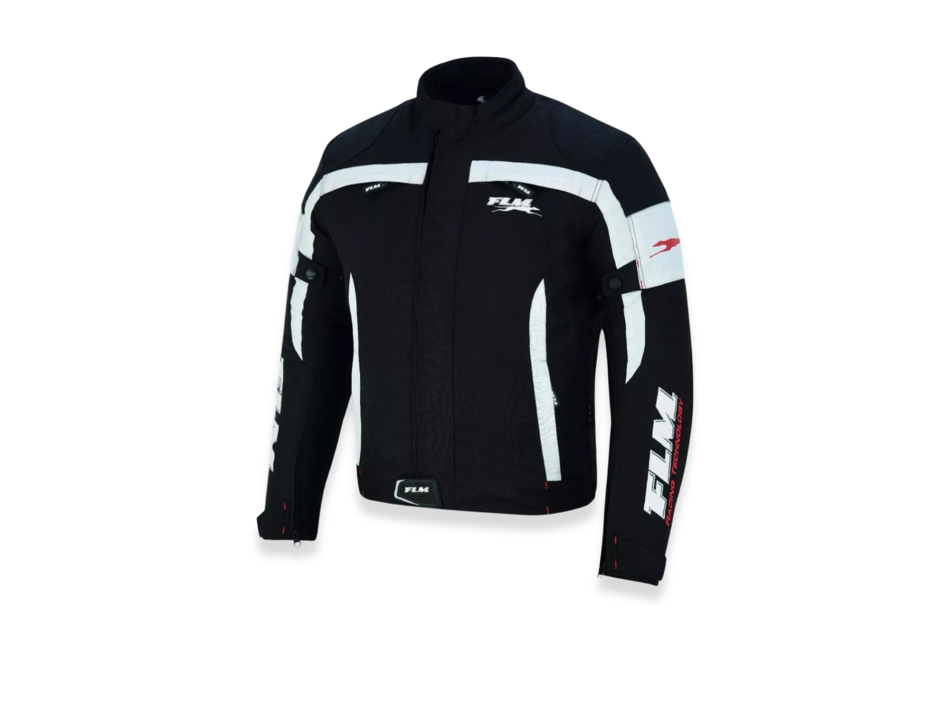 The FLM White/Black Men's Motorcycle Jacket combines durable 600D polyester, waterproof protection, and integrated armor for maximum safety and comfort on the road.