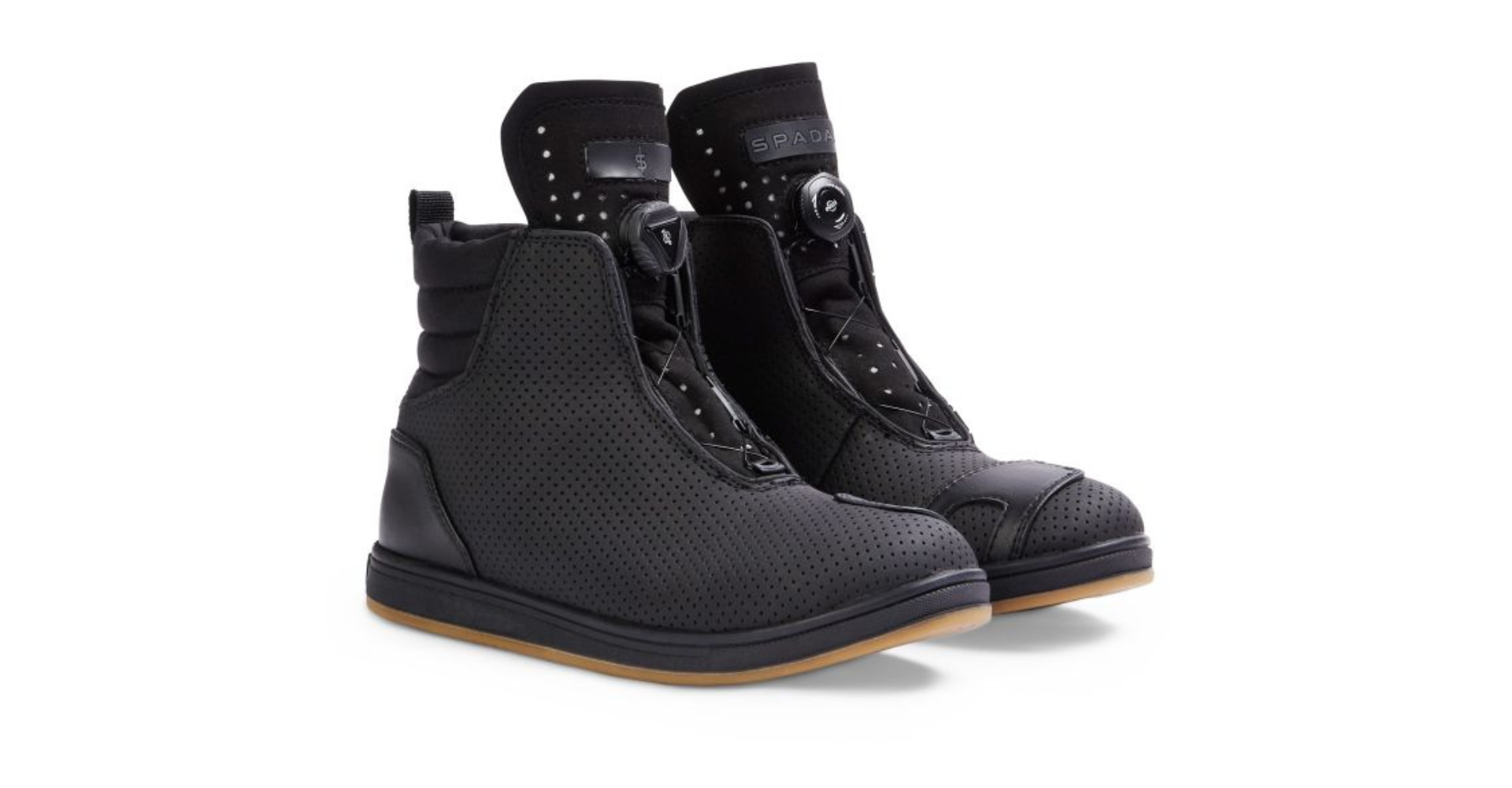 The Spada Tachi is a CE certified trainer that combines safety and style, featuring Level 1 upper height, Level 2 impact abrasion and cut protection, Level 1 transverse rigidity, a workout boot-style design with a natural gum sole, a waterproof membrane, and enhanced visibility elements like 3M reflective fabric and charcoal reflective piping.
